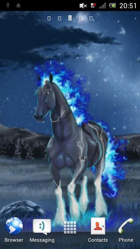 Mengatur hidup wallpaper gratis "Kuda dengan surai yang berapi-api", yang menggambarkan kuda dengan surai dan ekor yang terbuat dari api biru!