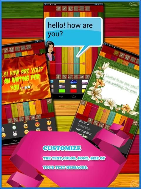 Warna teks SMS, aplikasi memungkinkan pelanggan seluler untuk mengirim dan menerima SMS berwarna-warni di phone.Express mobile mereka lebih banyak dengan Warna! Aplikasi ini memungkinkan upgrade pesan teks gaya lama ke tingkat yang baru dengan beberapa efek yang menakjubkan menambahkan. Anda dengan mudah dapat mengubah warna masing-masing karakter teks, mengubah warna latar belakang layar dan tema, beberapa font stylish, menambahkan emoticon yang berbeda.
