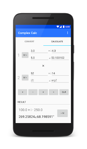 Complex Calc is an ad-free application used to find a complex number as a result of addition, subtraction, multiplication, and division of two complex numbers.