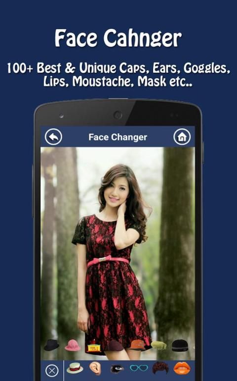 Wajah changer memiliki koleksi yang baik dari kumis, jenggot, masker, bibir, telinga, hidung, mata, topi, wig dan kacamata yang memungkinkan Anda untuk memberikan foto Anda sentuhan pribadi.