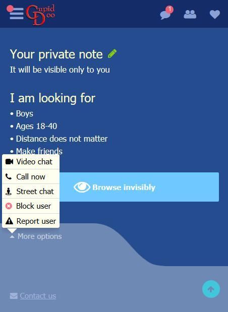 Di Cupid Doo baru Anda dapat melihat profil anggota kami dan mengobrol dengan mereka di Ruang Obrolan, Obrolan Cam Langsung, atau Obrolan Suara Langsung. Seperti pemberitahuan mereka, bertukar pesan atau hadiah, tutup mata mereka dan segera mulai berkenalan baru.