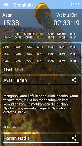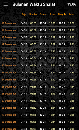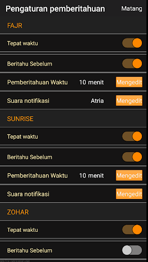 - Waktu Sholat alert dapat dikonfigurasi untuk setiap waktu shalat untuk kedua pemberitahuan awal dan tepat waktu.