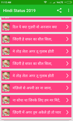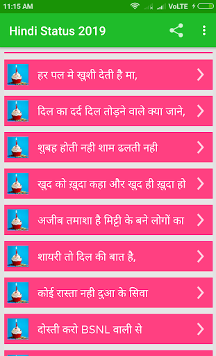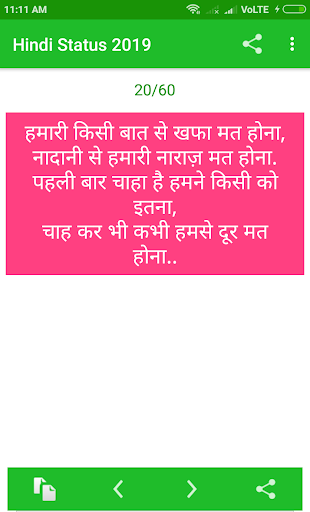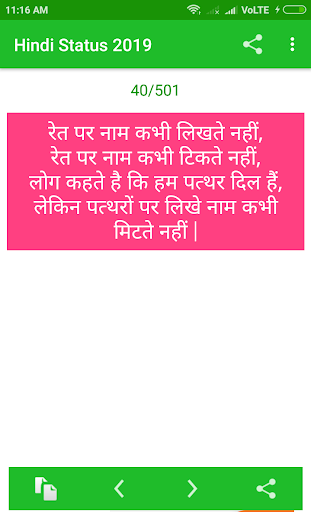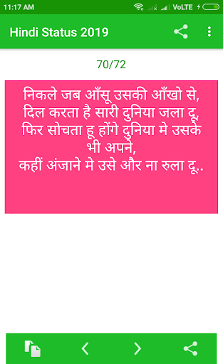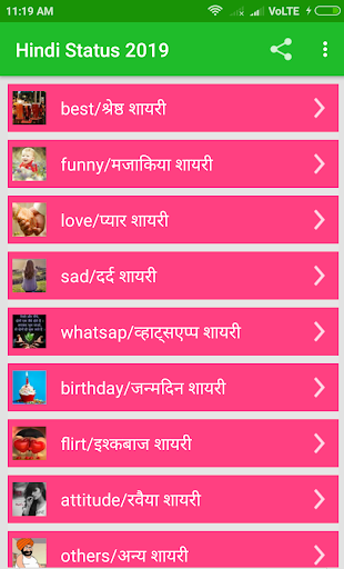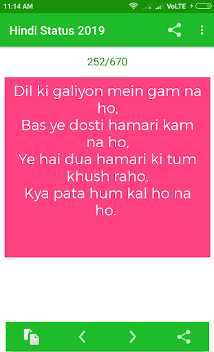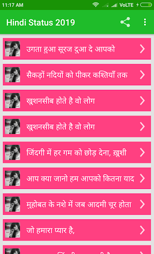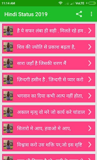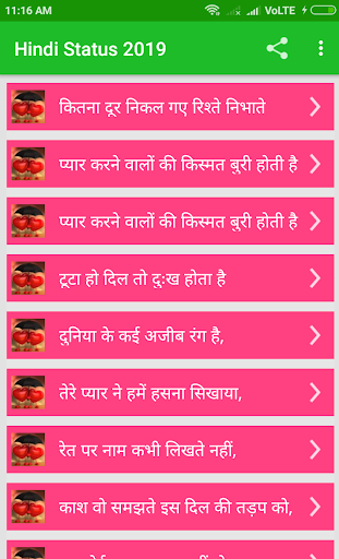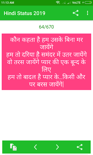 This app contains amazing hindi status messages for change your status according to your mood .Today in technology life social media is one of the popular place where everyone wants to be active and change there status according to mood for this must have this amazing application .
