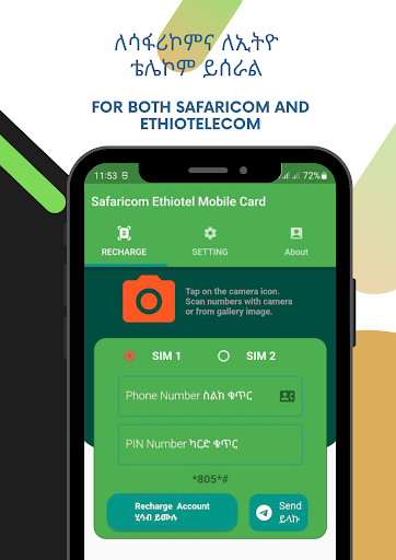 This is an application for scan recharge cards and top-up your Safaricom and Ethiotelecom mobile accounts. Buy cards from any shop and scan the paper with the app, and recharge. As simple as that.