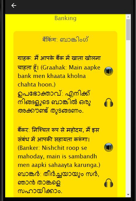 This language learning application can also be used by those Malayalam speaking participants who are preparing for BPO, Call Center, Hindi Discussions and Debates as well as Hindi job interview. If you want to learn Hindi grammar, it is advised that you initially go through this application get yourself ready for your next assignment. If I want to learn Hindi, I should be approaching this application for the same and go through all the chapters. This app can help you learn Hindi fast using audio. It is easier to learn the language using Hindi conversation rather than through an Hindi Dictionary. Learning Spoken Hindi had never been easier. Exercises, vocabulary and business Hindi make this application a very special one.
