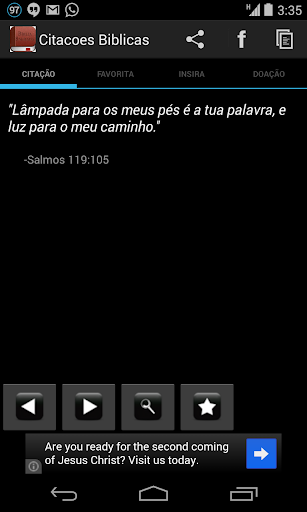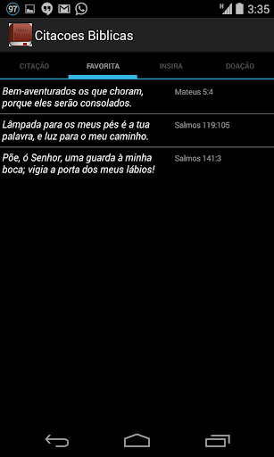 Se você quer nos ajudar a melhorar nossos aplicativos por favor carregue o nosso Citações Biblicas (doação). Custa apenas R $ 1.80. É o mesmo aplicativo, porem é usado como uma maneira de você fazer uma doação. Com este dinheiro seremos capazes de criar novos recursos e melhores maneiras para você e os outros a ler e aprender através de surpreendentes citações da Bíblia.