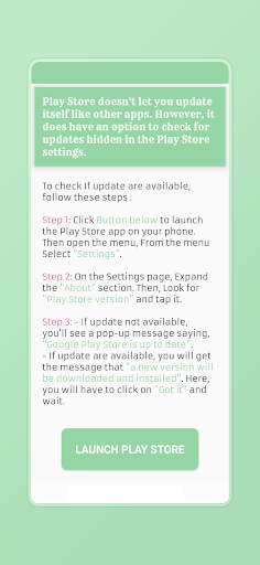 We know play store is an important app on android phone, we need use it to download apps. It like all apps, the Google Play Store itself receives occasional updates, but the google Play Store isn't an app in the traditional sense. It's not listed in the store itself, and because it isn't listed, it won't show in your list of apps we want to updated. So we developed the play store update app to help check and update your google play. So that we take advantage of the new features provided by the update.