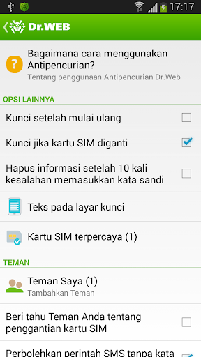 • Kemampuan membuat daftar kontak yang akan mendapatkan pemberitahuan jika terjadi penggantian kartu SIM pada perangkat yang hilang dengan nomor kartu SIM baru, yang dapat digunakan saat melapor ke polisi. Nomor ini dapat digunakan untuk membuka kunci ponsel jika Anda lupa kata sandi.