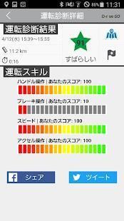 各回の運転ごとに、スマートフォンの加速度センサーや位置情報等のデータ分析結果により、「ハンドル操作」「ブレーキ操作」「スピード操作」「加速度」の各項目で診断され、総合スコアにより評価されます