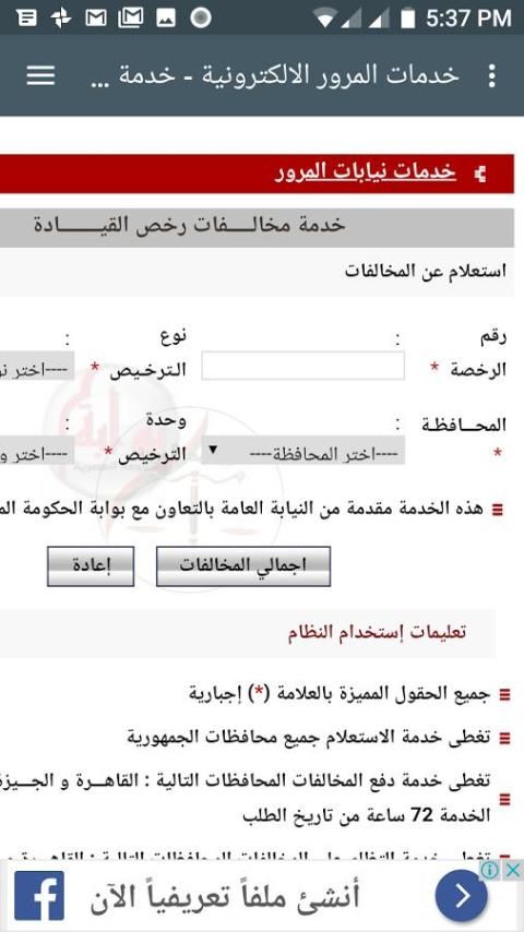 Aplikasi ini tergantung pada portal resmi pemerintah Mesir - procuratorates sektor lalu lintas meliputi: