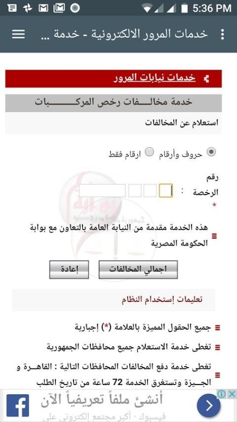 Catatan penting: hak untuk menanyakan tentang mobil penyimpangan kemudian ketik piring huruf dalam bahasa Arab dan kemudian mengubah papan setrika untuk bahasa Inggris untuk menulis nomor - situs resmi berlalunya procuratorates Mesir tidak menerima angka yang tertulis dalam bahasa Arab dan memberikan pesan kesalahan jika ditulis dalam bahasa Arab.