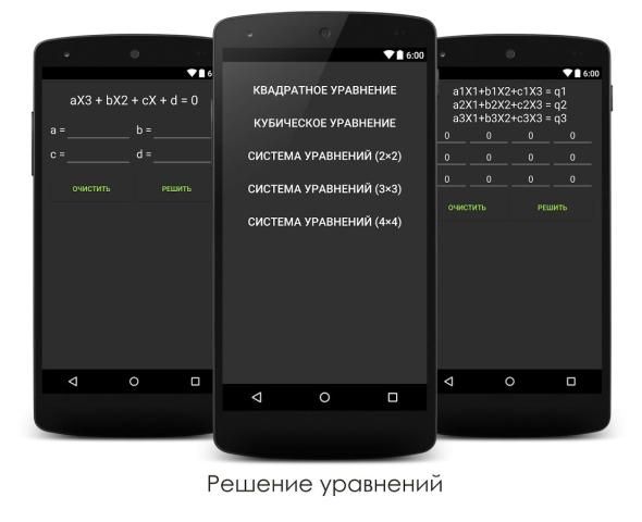 Hanya pada saat aplikasi memungkinkan untuk memecahkan persamaan kuadrat dan kubik. Kemungkinan memecahkan sistem persamaan linear, yang terdiri dari dua, tiga dan empat persamaan. Dalam memecahkan persamaan kuadrat dan kubik mendukung akar kompleks.