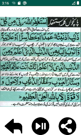 اَسْتَغْفِرُ اللهَ رَبِّىْ مِنْ كُلِّ ذَنْۢبٍ اَذْنَبْتُهٗ عَمَدًا اَوْ خَطَا ًٔ سِرًّا اَوْ عَلَانِيَةً وَّاَتُوْبُ اِلَيْهِ مِنَ الذَّنْۢبِ الَّذِیْٓ اَعْلَمُ وَ مِنَ الذَّنْۢبِ الَّذِىْ لَآ اَعْلَمُ اِنَّكَ اَنْتَ عَلَّامُ الْغُيُوْبِ وَ سَتَّارُ الْعُيُوْبِ و َغَفَّارُ الذُّنُوْبِ وَ لَا حَوْلَ وَلَا قُوَّةَ اِلَّا بِاللهِ الْعَلِىِّ الْعَظِيْمِؕ