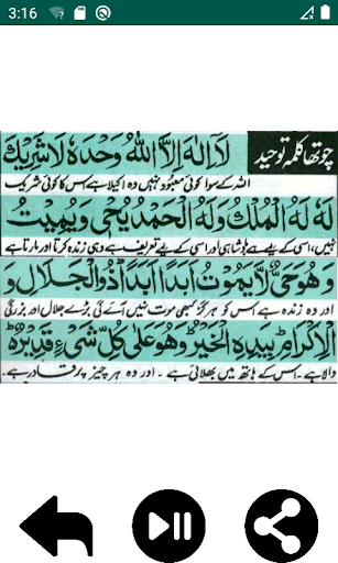 لَآ اِلٰهَ اِلَّا اللهُ وَحْدَهٗ لَا شَرِيْكَ لَهٗ لَهُ الْمُلْكُ وَ لَهُ الْحَمْدُ يُحْىٖ وَ يُمِيْتُ وَ هُوَحَیٌّ لَّا يَمُوْتُ اَبَدًا اَبَدًاؕ ذُو الْجَلَالِ وَالْاِكْرَامِؕ بِيَدِهِ الْخَيْرُؕ وَهُوَ عَلٰى كُلِّ شیْ ٍٔ قَدِیْرٌؕ
