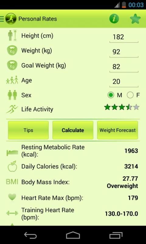 * Personal tarif (BMI, RMR, kalori harian dan asupan air, detak jantung maksimum, pelatihan denyut jantung, juga termasuk rekomendasi, dan perkiraan berat masa depan);