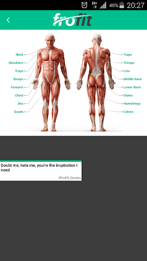 If you're training and need something to motivate you, Frofit has lots of motivational ways that can be used to stay motivated, read about your idols while resting between sets, learn how to perform an exercise.