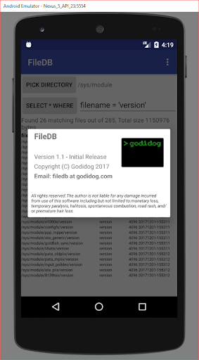 File DB lets you scan any folder and makes a database containing information about all the files it finds, and allows you to query that database using simple, standard SQL queries.