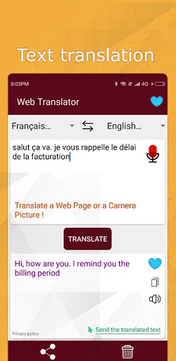 Translate adalah penerjemah Anda yang sangat diperlukan, kami menyediakan terjemahan suara, teks, dan kamera untuk memungkinkan Anda berkomunikasi tanpa hambatan di semua bagian dunia;