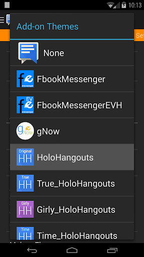 To select this theme, open up EvolveSMS, Settings>Theme Settings>(scroll down to Add-On Themes)>Use Add-on Theme>HoloHangouts
