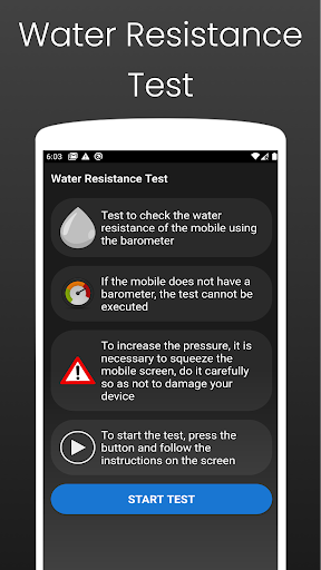 This application performs a test to see if your phone continues is still waterproof using the barometer, as long as it is IP67/IP68 certified. Over time, water resistance can be compromised by a drop or change of an internal component. If you have bought a second-hand waterproof phone, you can check if it has been opened or has any damage.