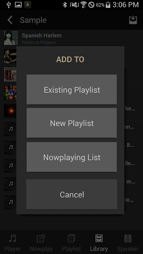 Library: allows you to select the song you want to play the stored equipment and Internet radio, streaming services.