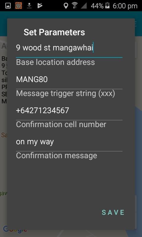 Hal ini juga memungkinkan untuk mengatur beberapa parameter lain dalam menu konfigurasi seperti alamat dasar Anda. Hal ini diperlukan sebagai bagian dari setup awal dan berfungsi untuk uji Geocode bekerja dengan benar. Selain itu sejumlah sel konfirmasi dan pesan harus dikonfigurasi. Ini memungkinkan penerima pesan teks untuk memfasilitasi pengiriman pesan balasan ke sejumlah sel yang telah dikonfigurasikan. Sebuah pesan respon juga dapat dikonfigurasi tetapi diubah sebelum pengiriman pesan jika diperlukan. Tindakan ini dimulai dengan melakukan tekan lama pada peta dan dapat digunakan untuk memberitahu sebuah operator yang pesan sedang ditindak atau untuk menyarankan sistem otomatis yang sama.