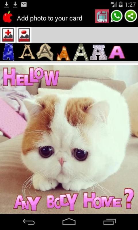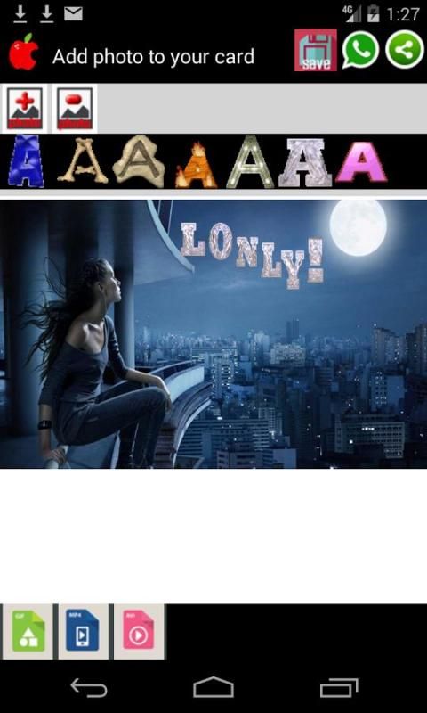 GIF Pindah Word dapat dimasukkan ke dalam Photo mobile, dengan font yang berbeda, ukuran dan posisi. Hal ini dapat disimpan dalam galeri anda dengan penjelasan singkat dari foto dengan karakter lucu untuk mencerminkan suasana hati Anda, seperti api atau es.