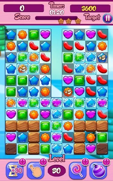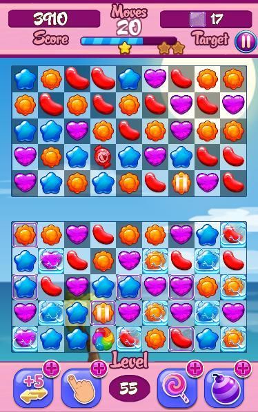 Swipe your finger to Match 3 or more candies pieces either horizontally or vertically to destroy and crush them or the obstacles.
