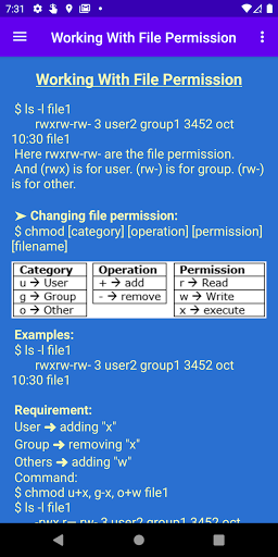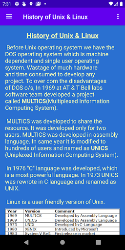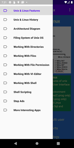 Anda dapat mempelajari Unix dan Linux dengan mudah menggunakan aplikasi ini.Kami telah menyediakan informasi yang sangat sederhana dan jelas dengan diagram arsitektur terbaik dan contoh.Kami telah menyediakan navigasi yang sangat baik untuk pindah dari satu halaman ke halaman lain di aplikasi Unix dan Linux ini.Ini adalah aplikasi yang sepenuhnya gratis.