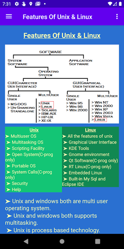 Di bawah ini adalah daftar informasi yang disediakan tentang Unix dan Linux di aplikasi ini.