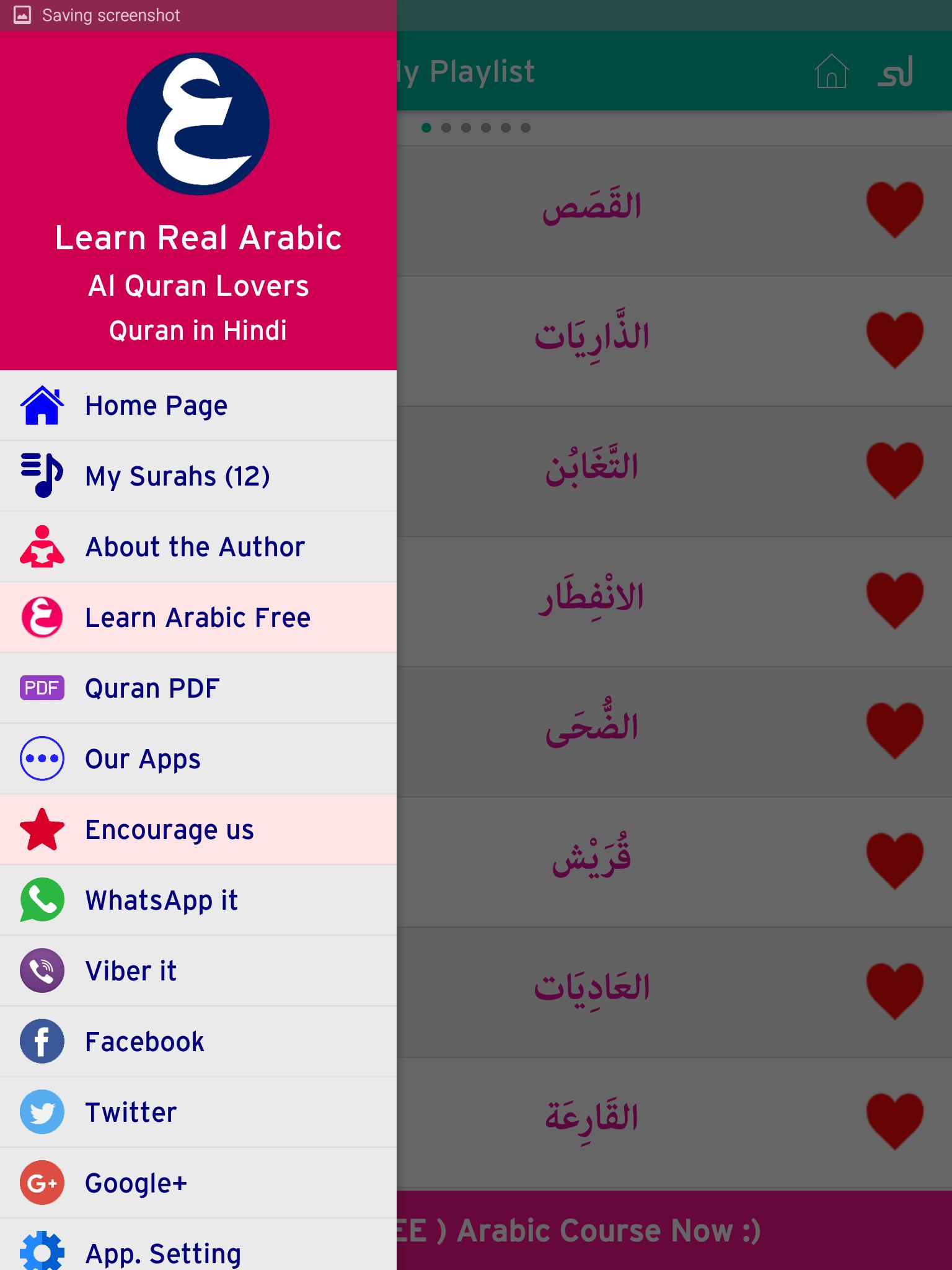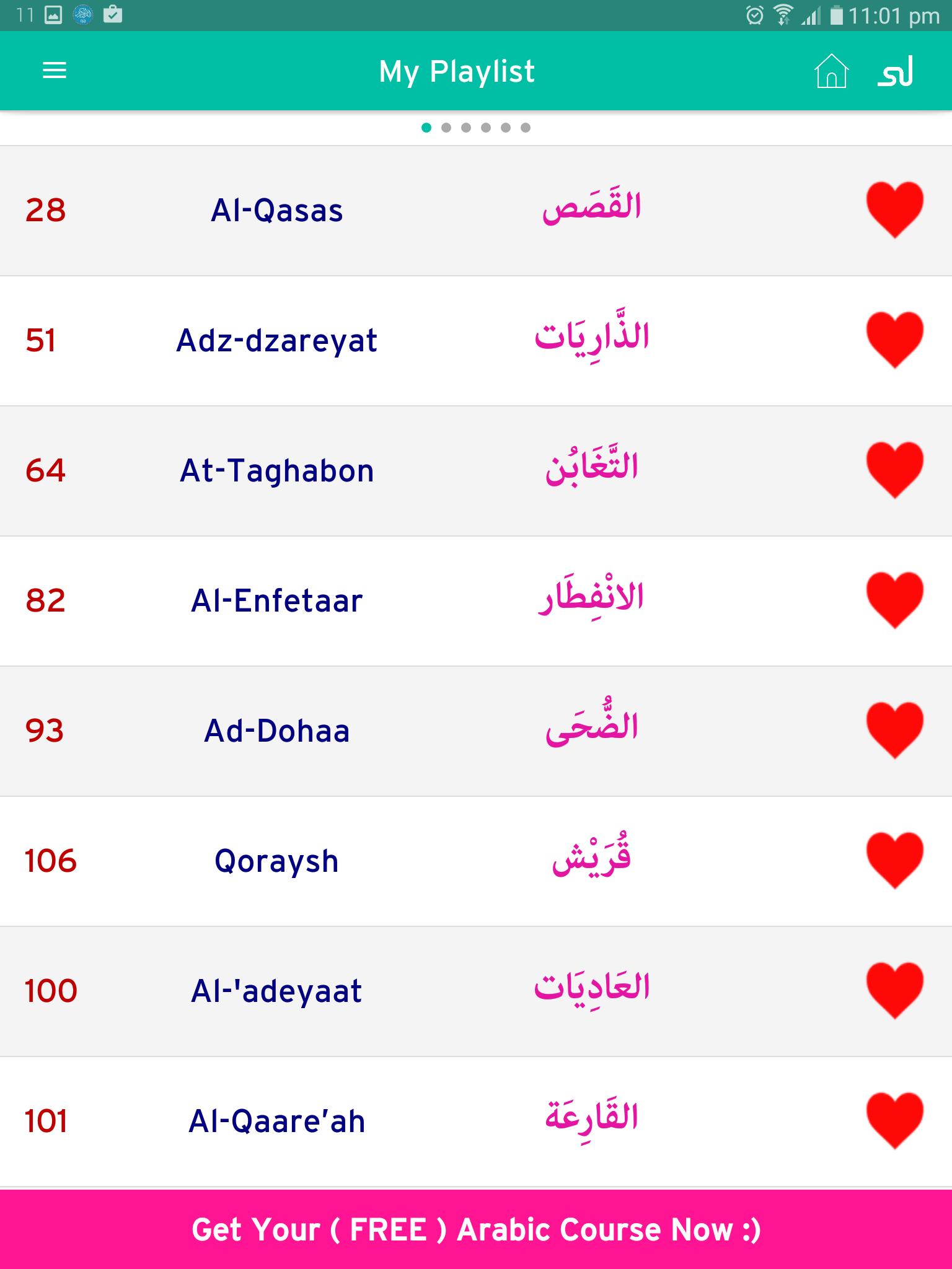 Main screen is featured with entire Quranic Surahs with customized settings which contain: