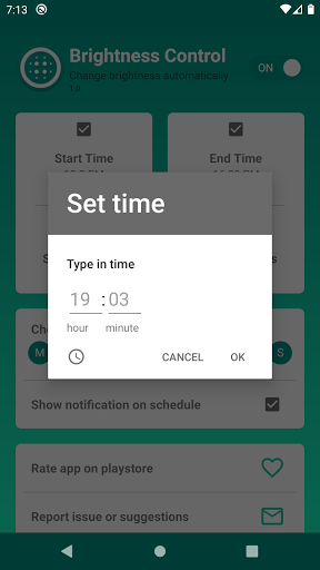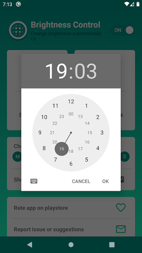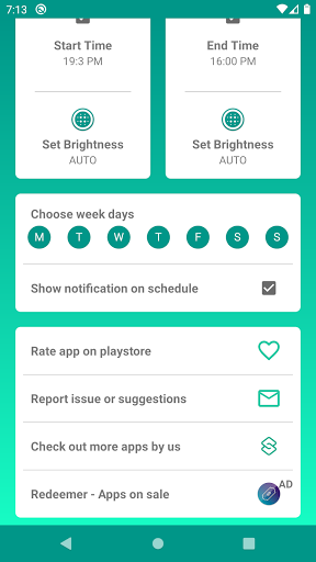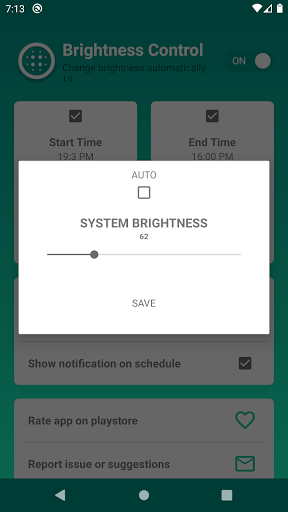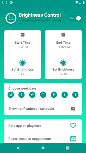 Auto change brightness based on the time you configure. app offers you simple yet meaningful option to configure brightness based on the time of the day.