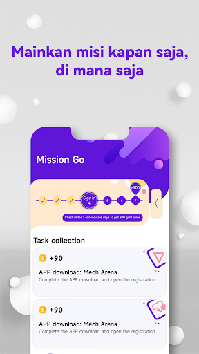 Mission Go memiliki berbagai jenis tugas koin emas, seperti: kuesioner, demo game, koin bonus masuk, yang akan diperbarui dan dirilis setiap hari. Selain itu, menyelesaikan misi di Mission Go sangat mudah; Anda hanya perlu ponsel untuk melakukannya, dan setelah selesai, Anda bisa mendapatkan koin emas yang tinggi untuk ditukarkan dengan hadiah cashout.