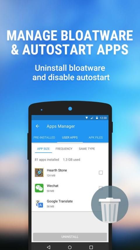 Pengelola Autostart dapat menguninstal atau menonaktifkan sistem aplikasi/bloatware/pra-instal aplikasi untuk mencegah aplikasi dari memulai secara otomatis (Anda mungkin membutuhkan izin root) untuk meningkatkan perangkat Android Anda. Uninstal aplikasi yang tidak diinginkan yang telah Anda instal dan hapus file apk cadangan yang tidak berguna untuk mengosongkan penyimpanan Anda.
