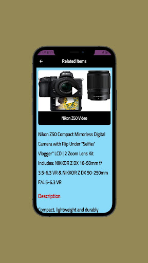 dan tipe kedua yang berisi aplikasi Kamera Nikon adalah Nikon Z50 yang memiliki desain kompak kecil. Bahkan dengan lensa, baterai dan kartu SD, beratnya 585g. Viewfinder elektronik sangat baik dan memiliki lag minimal.