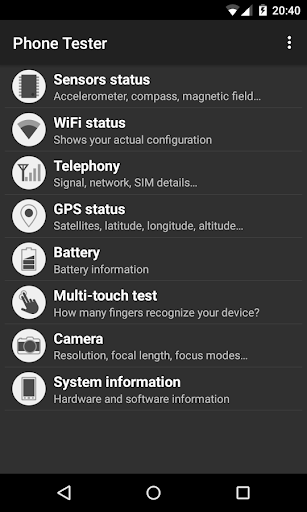 Aplikasi ini memungkinkan Anda untuk menguji operasi yang benar dari banyak bagian perangkat Anda (telepon atau tablet).Anda dapat menguji hal berikut: