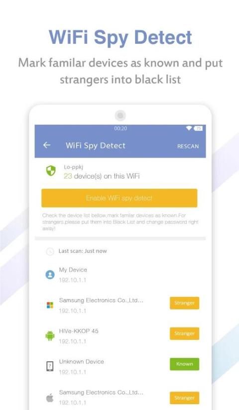 Memindai semua perangkat yang terhubung ke hotspot WiFi Anda, termasuk Android Phones, iPhone / iPad, PC. Tampilkan merek perangkat dan MAC dalam rincian, sehingga Anda dapat mengetahui yang mengkonsumsi WiFi dan memperlambat kecepatan jaringan. Anda juga dapat mengevaluasi tingkat keamanan Anda, mendeteksi penyusup dan menyelesaikan segala macam masalah jaringan.