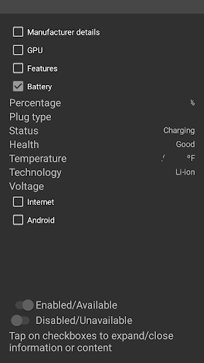 Obtain full info. about your battery: Percentage, Temperature, voltage and technology.