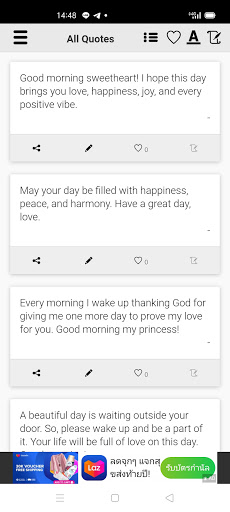Ini adalah aplikasi yang menyimpan banyak harapan selamat pagi untuk pacar.Saya akan terus menambahkan kutipan baru tepat waktu.Ada banyak pesan selamat pagi yang dapat Anda kirim ke pacar Anda.