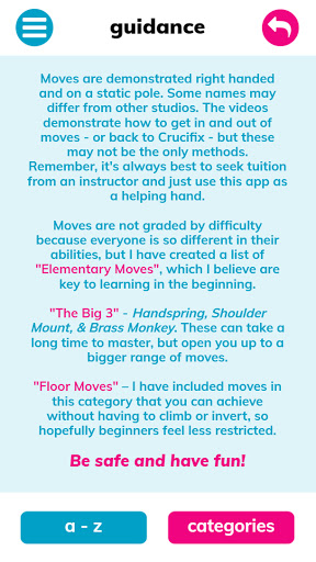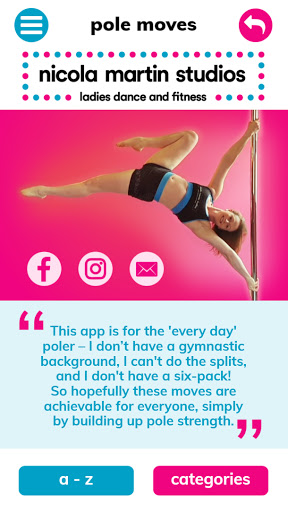 Aplikasi seluler yang dibuat untuk Poler 'setiap hari' - orang yang mungkin tidak super bendy atau memiliki perut papan cuci! Ada lebih dari 500 gerakan tarian tiang mulai dari kursi dasar hingga pers pendingin super. Ada beberapa tips tentang setiap langkah untuk membantu memandu Anda, serta video demonstrasi penuh. Anda dapat menggunakan aplikasi ini untuk menemukan inspirasi untuk gerakan atau variasi baru pada yang lama, tetapi selalu pastikan Anda aman jika Anda belajar di rumah. Bergerak tidak dinilai dengan sulit hanya karena setiap orang memiliki kekuatan dan kelemahan mereka sendiri, tetapi Anda dapat mencari berdasarkan kategori dan bahkan menempatkan gerakan ke dalam daftar 'favorit'. Harap dicatat bahwa gerakan dapat disebut berbagai hal di studio yang berbeda, dan itu selalu terbaik untuk mencari saran atau pelatihan dari seorang instruktur.