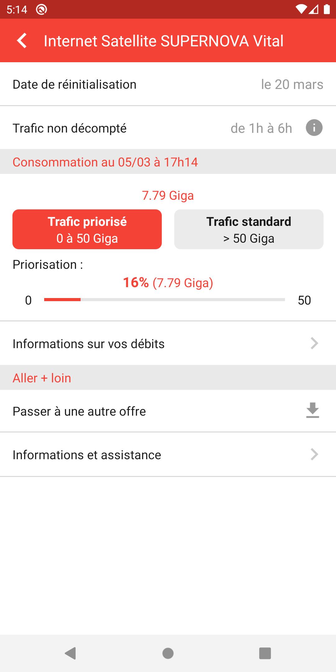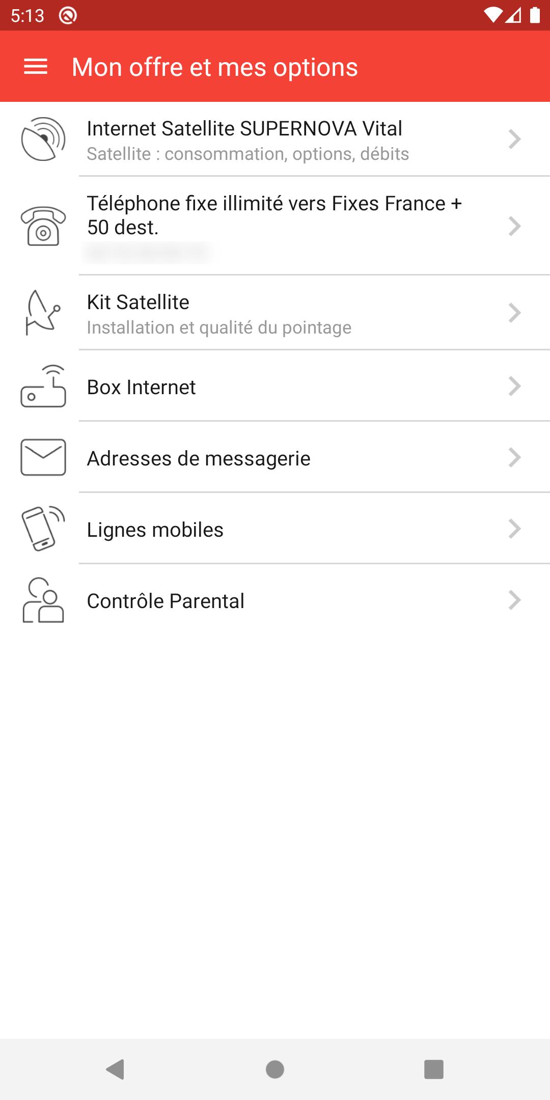 Selon votre abonnement, vous pouvez visualiser l’état de votre trafic Internet Satellite, consulter vos achats VOD, les appels depuis votre ligne de téléphone fixe, les consommations (appels, SMS/MMS et Internet) de votre ligne mobile...