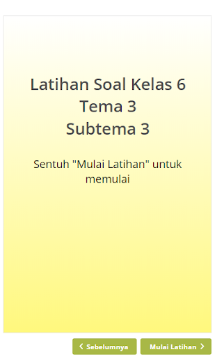Aplikasi latihan soal ini disediakan pada setiap sub tema dan ulangan pada setiap tema. Soal akan muncul secara acak pada setiap latihan, terdiri dari lebih dari 200 soal yang bevariasi.