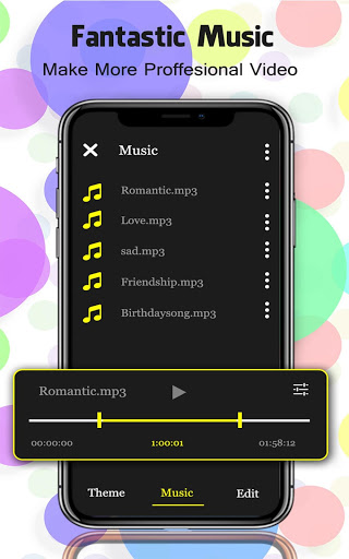 * Musik: Aplikasi ini menyediakan melodi yang cocok dengan setiap tema video. Anda juga dapat menambahkan lagu dan trek musik favorit Anda dari perangkat untuk membuat video Anda menarik dan menarik.