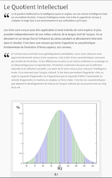 L'application Testez votre Q.I (quotient intellectuel) est un test qui vous permet de calculer votre quotient intellectuel ou QI qui est le résultat d'un test psychométrique qui, entend fournir une indication quantitative standardisée liée à l'intelligence abstraite..
