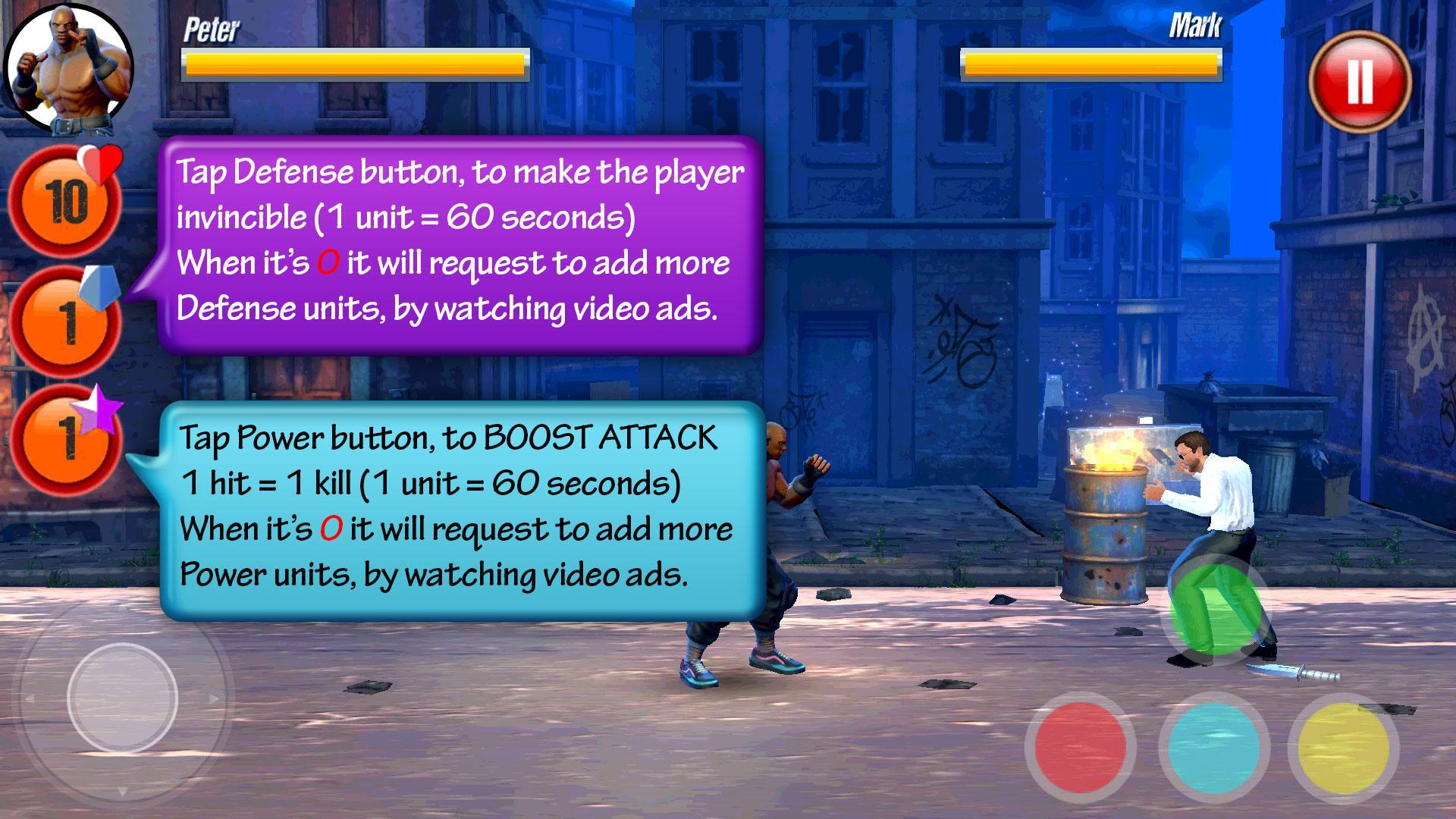 Shield/Defense Button: Use (tap) it to make your character strong, 1 Defense unit will work for 60 seconds. *when the button status is