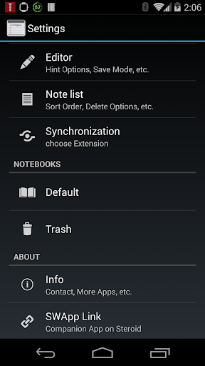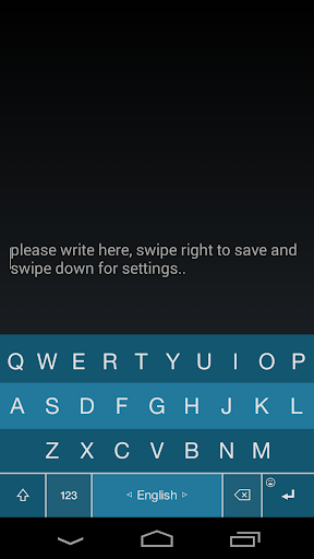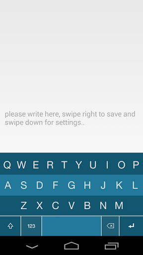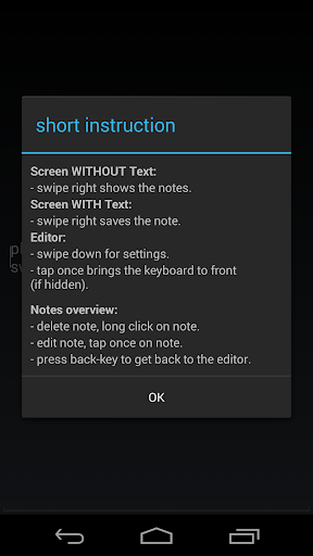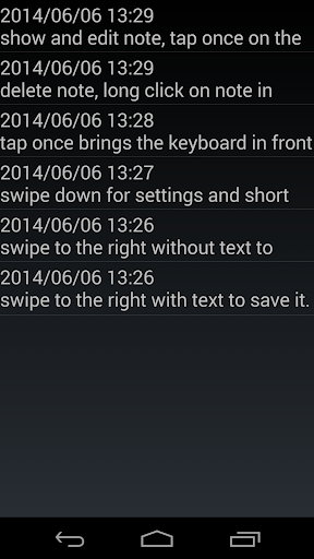Geser ke bawah akan membawa Anda ke halaman pengaturan. Ketika bidang edit kosong, Anda dapat menggeser ke atas atau kanan untuk menampilkan daftar catatan. Jika Anda menulis sesuatu ke dalam bidang edit dan geser ke atas atau kanan catatan disimpan.