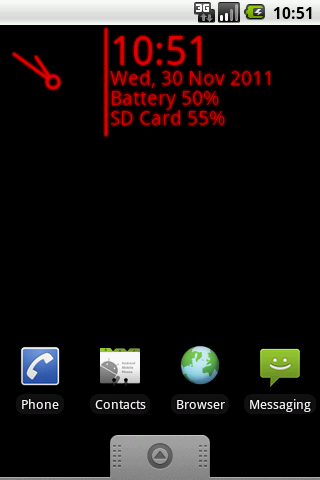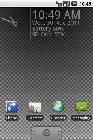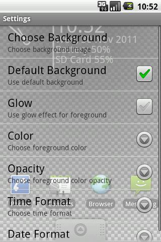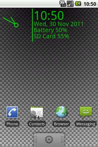 Nice and simple live wallpaper displaying the time, date, battery and SD card usage over a selected background image. Slow updates, which will make your battery love this app.Features: Analogue clock on the left side Current time and date on the right Battery usage SD card usageInstallation: Install the application Select Menu Wallpaper Select Live Wallpapers Select Minimalistic Clock Wallpaper If needed, change Settings background, color, opacity Select Set WallpaperPlanned Updates: Choose from a number of default backgrounds Fix update issue from settings update immediately Fix time lag issue could not reproduce yet, would appreciate any helpKnown Issues: On some platforms, when changing selections, the updates are applied after the next clock cycle max 1 min.