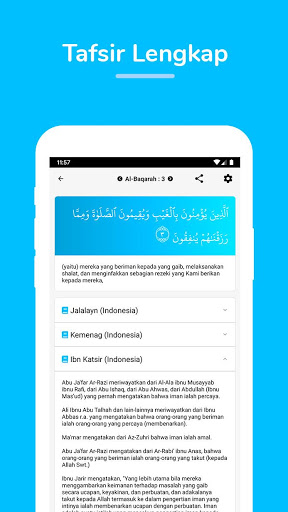 - Bermacam terjemahan dan Tafsir, saat ini tersedia tafsir Kemenag, Jalalayn, Ibnu Katsir dan kami akan menambahkan lebih banyak terjemahan dan tafsir lainnya, insya Allah