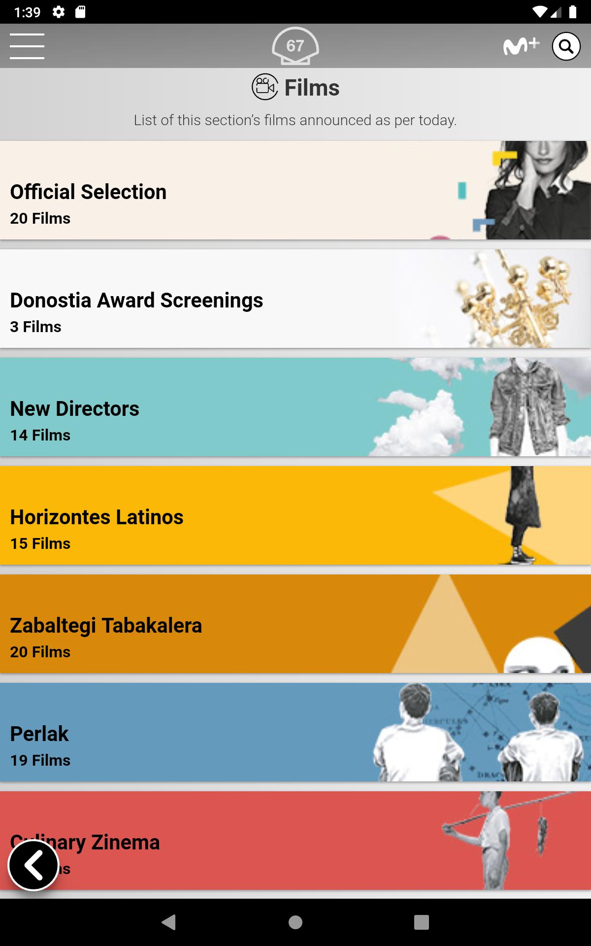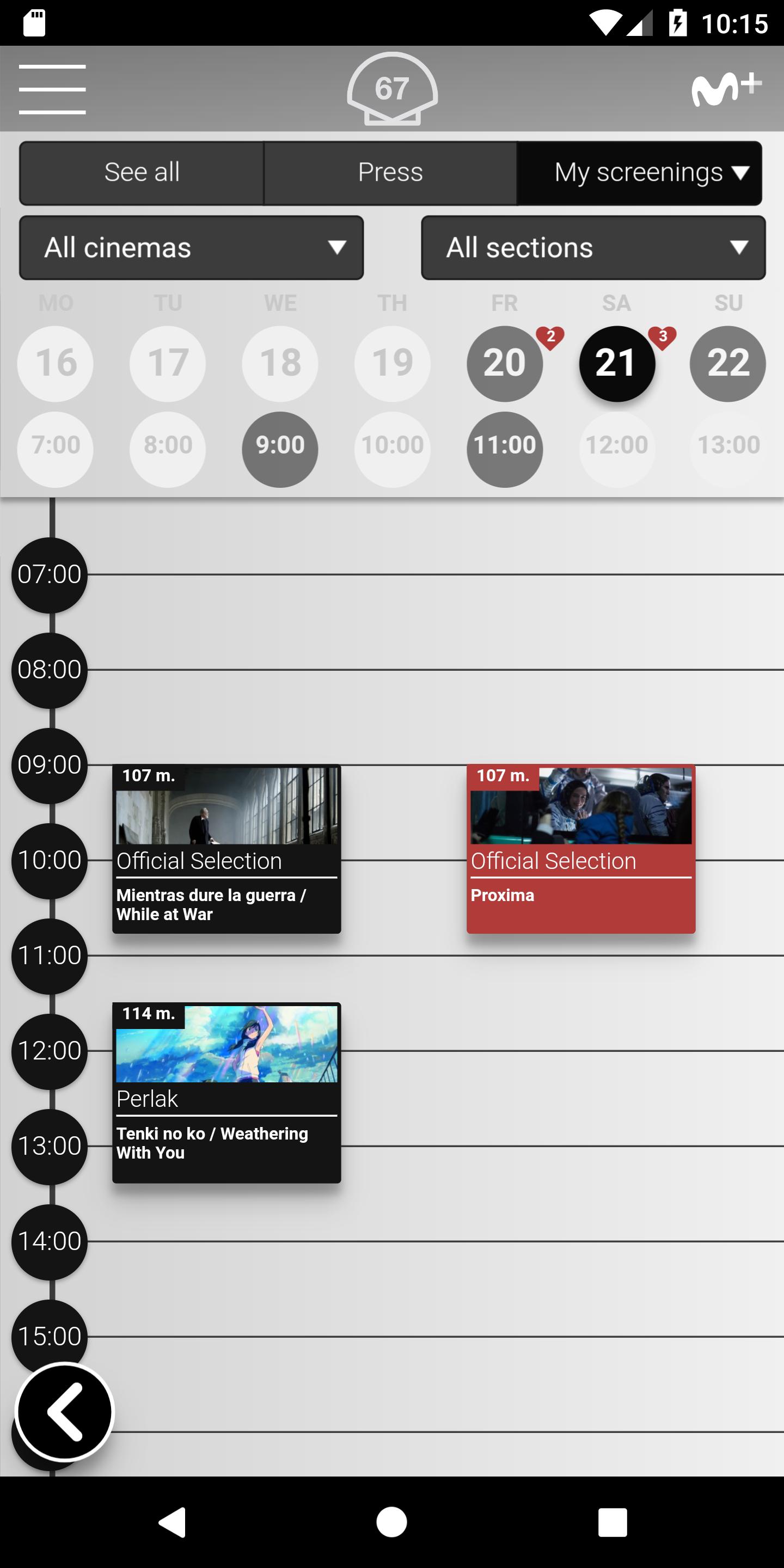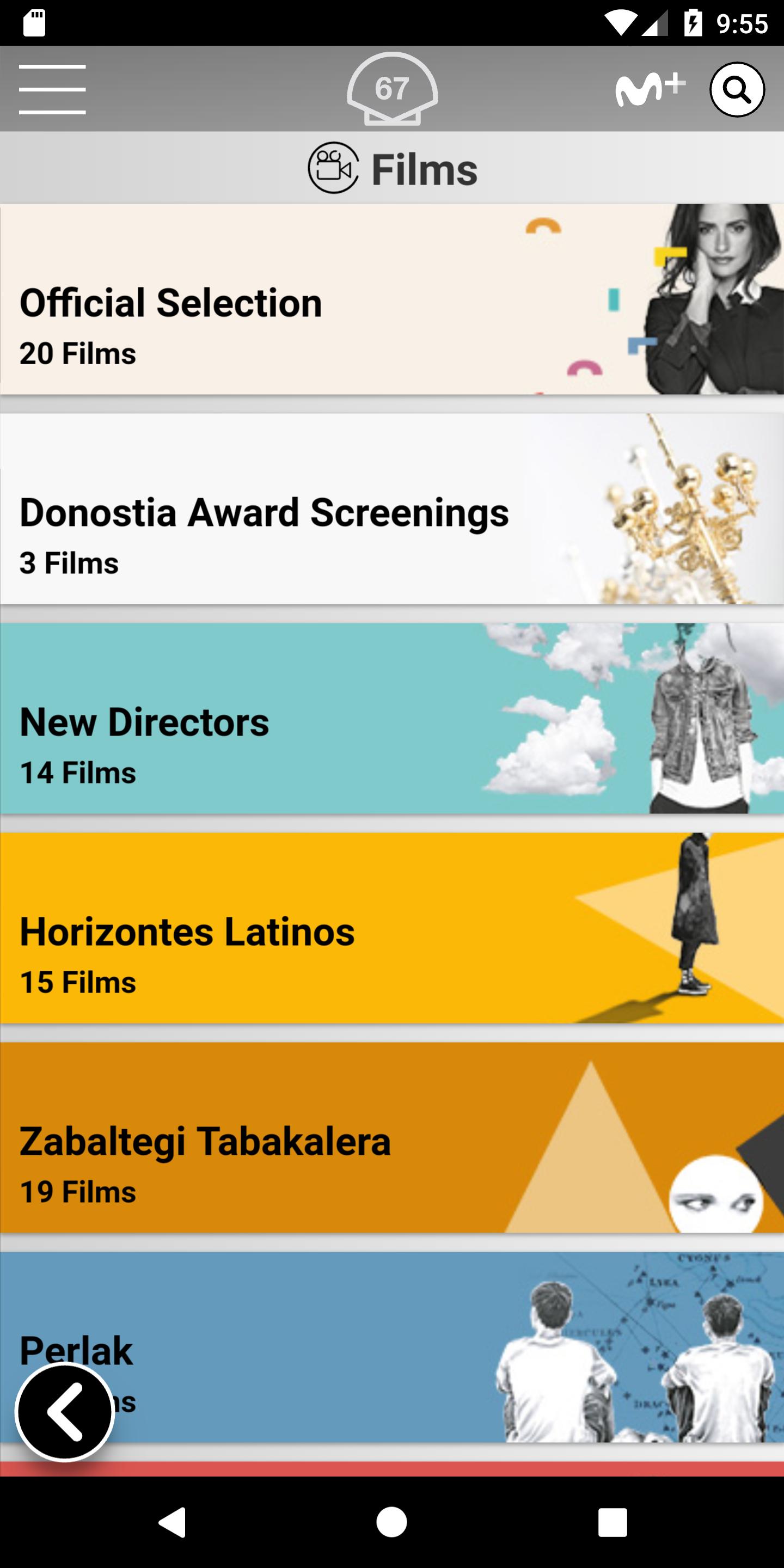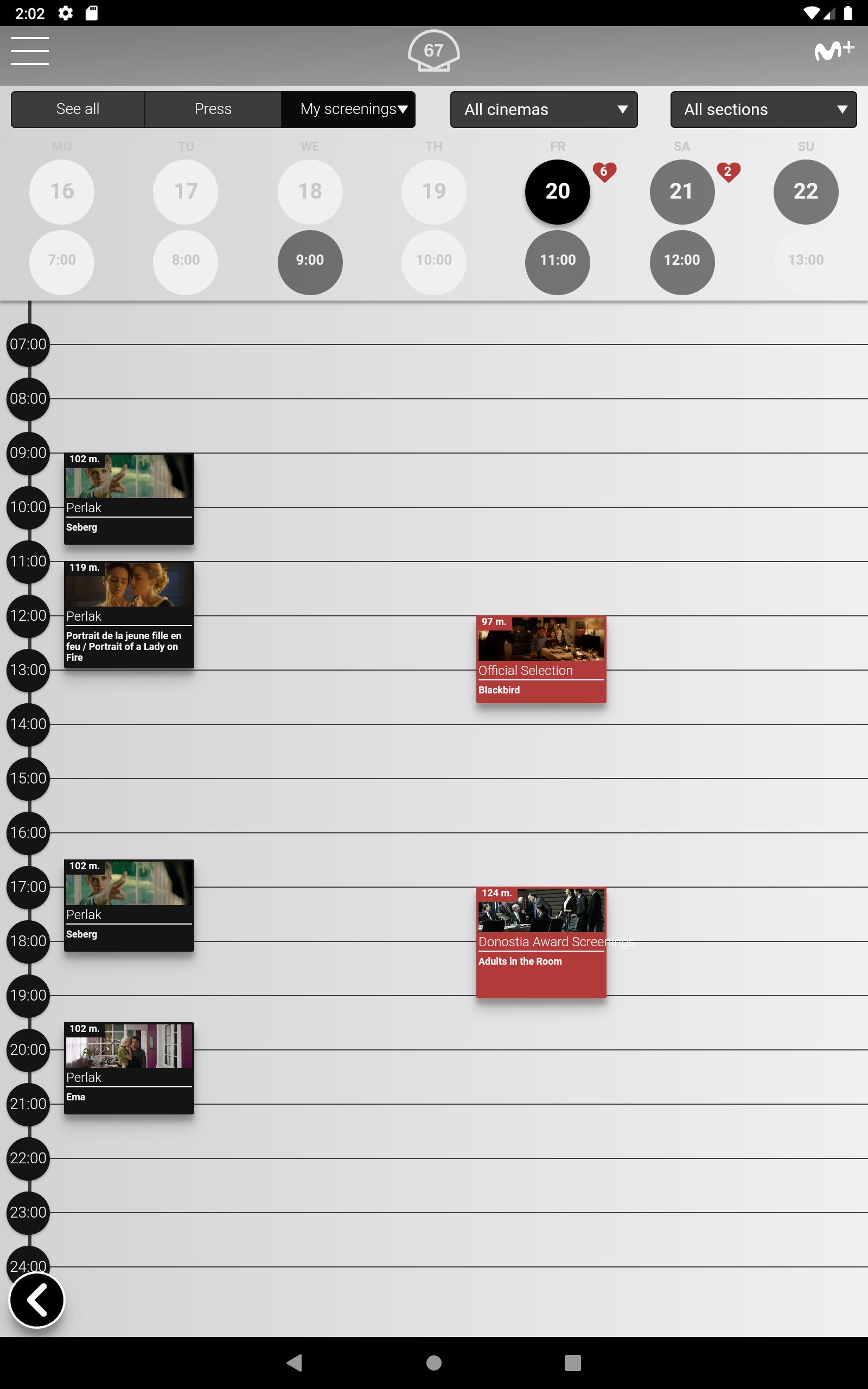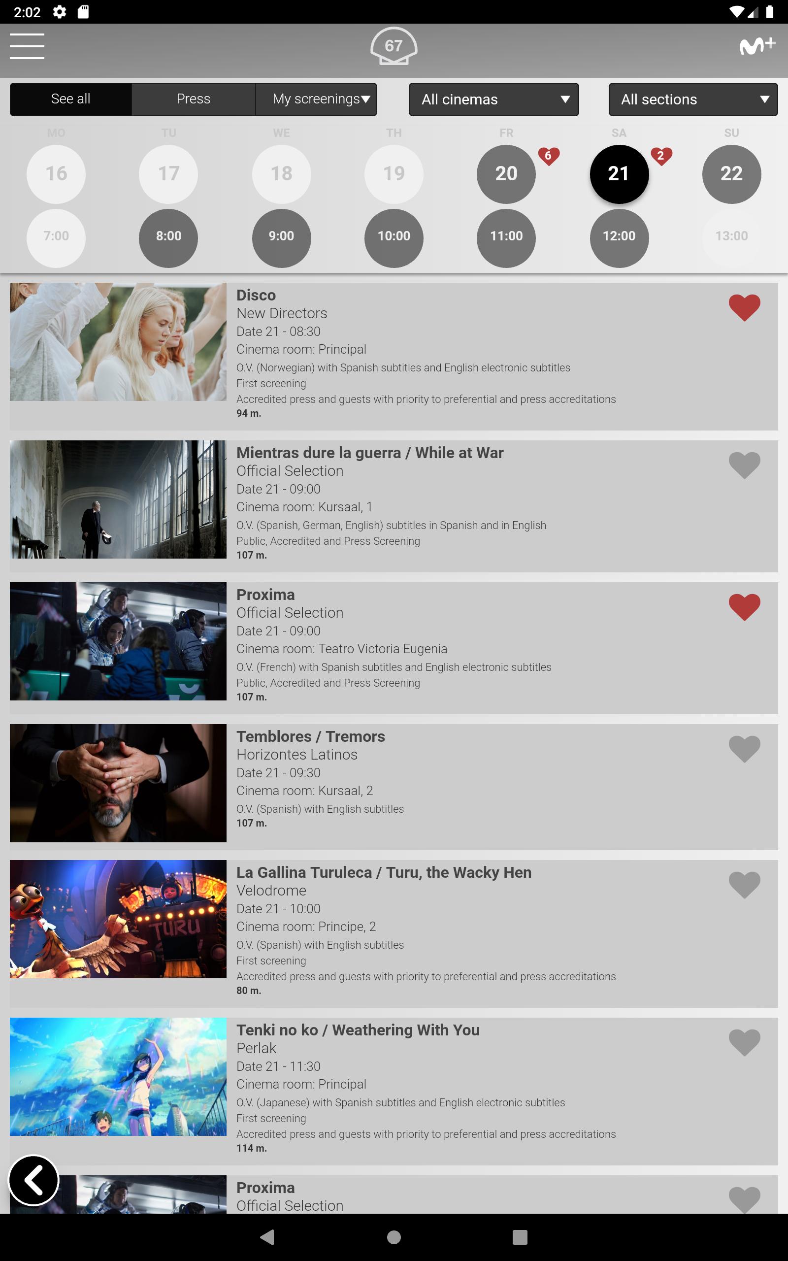 • Complete programme with full information about the films, synopsis, biography, technical and artistic fact sheets, trailer, images, cinemas and screening times, organised by day, title, cinema or section.