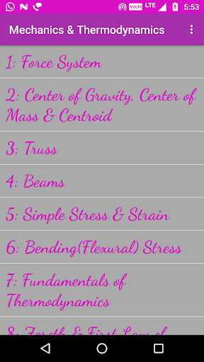 Aplikasi ini menyajikan tujuan memberikan pengetahuan yang efektif dan esensial tentang mekanika & termodinamika dengan cara yang mudah dan sistematis.Ini membantu untuk memperkuat konsep-konsep yang diperlukan yang digunakan dalam berbagai aplikasi standar ilmu pengetahuan dan hari ke hari dalam kehidupan industri. Dalam hal ini aplikasi ini berguna untuk-